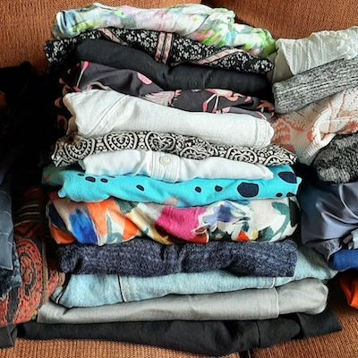 Wel nam ik afscheid van een vijftiental kledingstukken die beter bij een jonger en slanker iemand passen: jurken en shirts met spaghettibandjes, korte rokjes, strakke jurkjes. De kans dat ik op korte termijn 5 kilo zou afvallen, zodat ze weer goed zouden passen, achtte ik klein. En jonger word ik sowieso niet. Beter dat een ander er plezier van heeft. Ook van een tiental stukken kleding van synthetische materialen kon ik afstand doen, omdat ik om diverse redenen kleding van natuurlijke materialen wil dragen. Onder andere omdat synthetische kledingstukken bij het wassen microplastics lekken die in water, bodem en lucht terecht komen en onze oceanen vervuilen. Het is beter voor Moeder Aarde om natuurlijke materialen te dragen en die niet te vaak, met natuurlijke wasmiddelen te wassen.